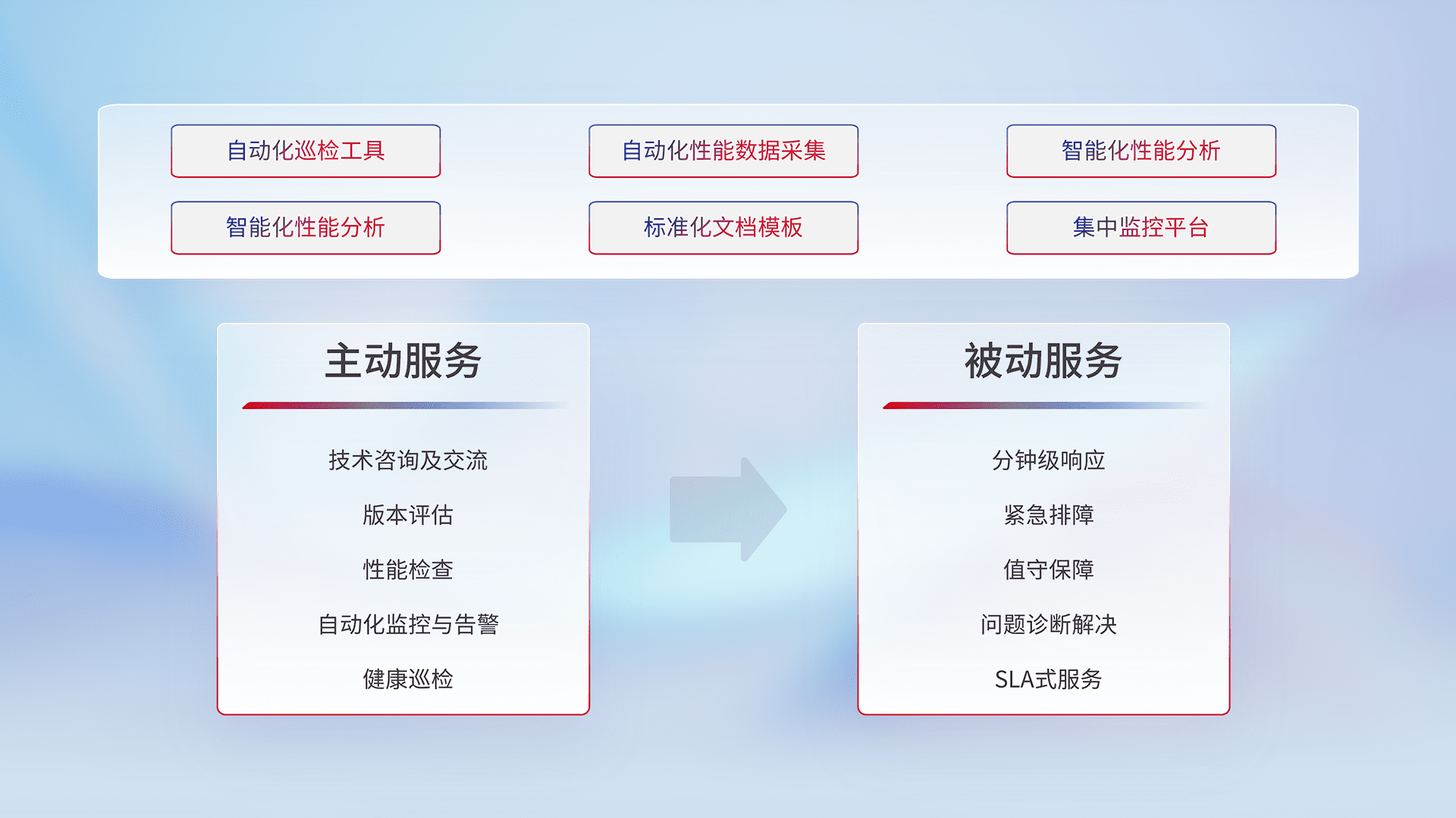 智能化工具和标准化文档,,保障服务质量,,提供主动服务(包含技术咨询、、版本评估、、、、性能检查、、、、自动化监控与告警、、健康巡检)和被动服务包含(分钟级响应、、、、紧急排障、、值守保障、、、问题诊断解决、、、SLA服务)。。