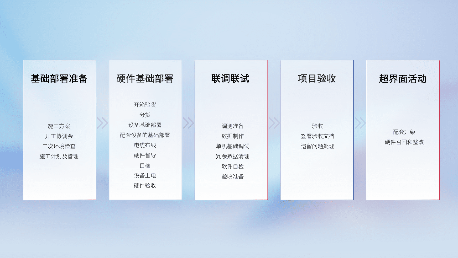 从基础部署准备、、硬件基础部署、、、联调联试、、项目验收、、、、越界面活动的全过程可追溯,,保证施工质量和进度。。